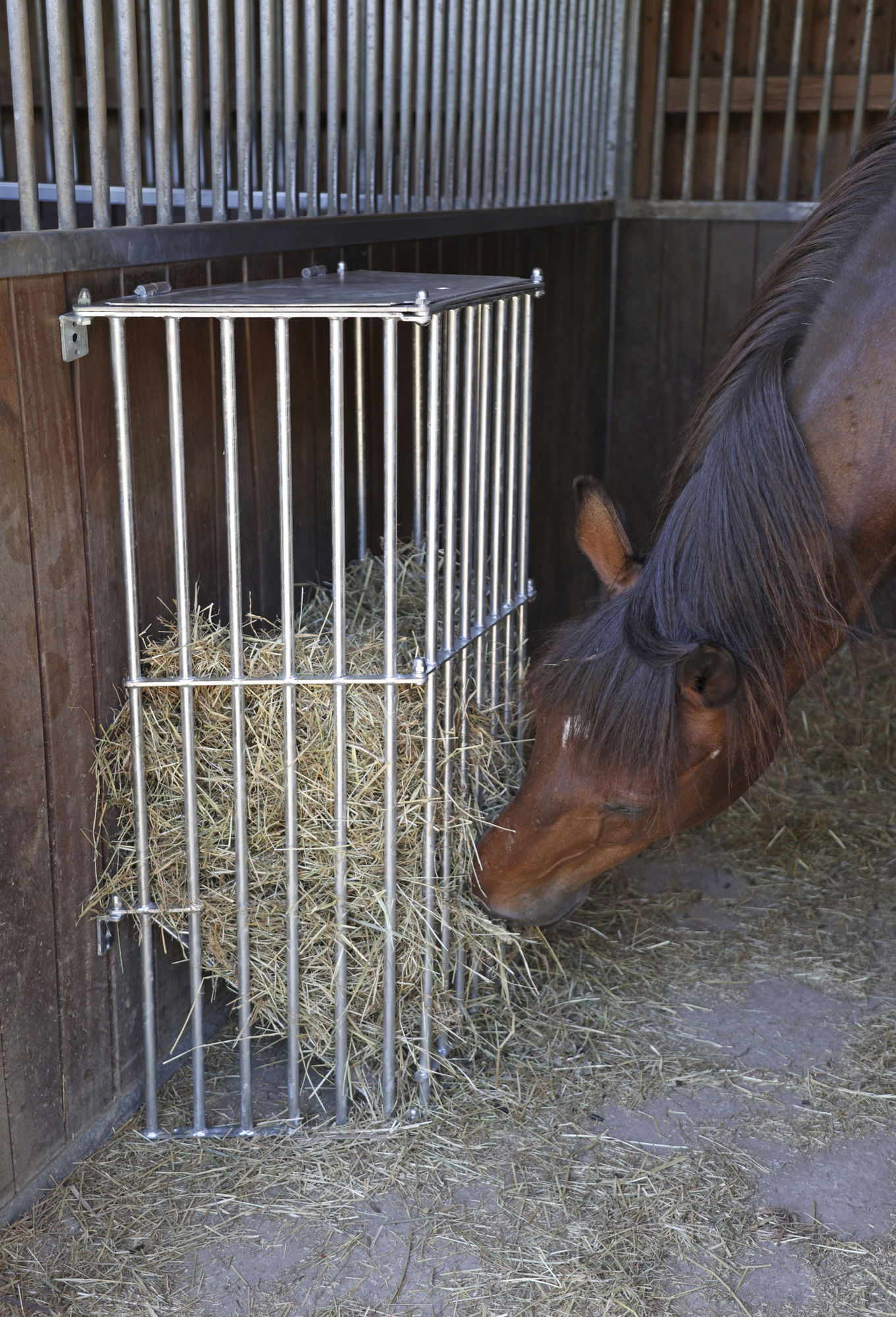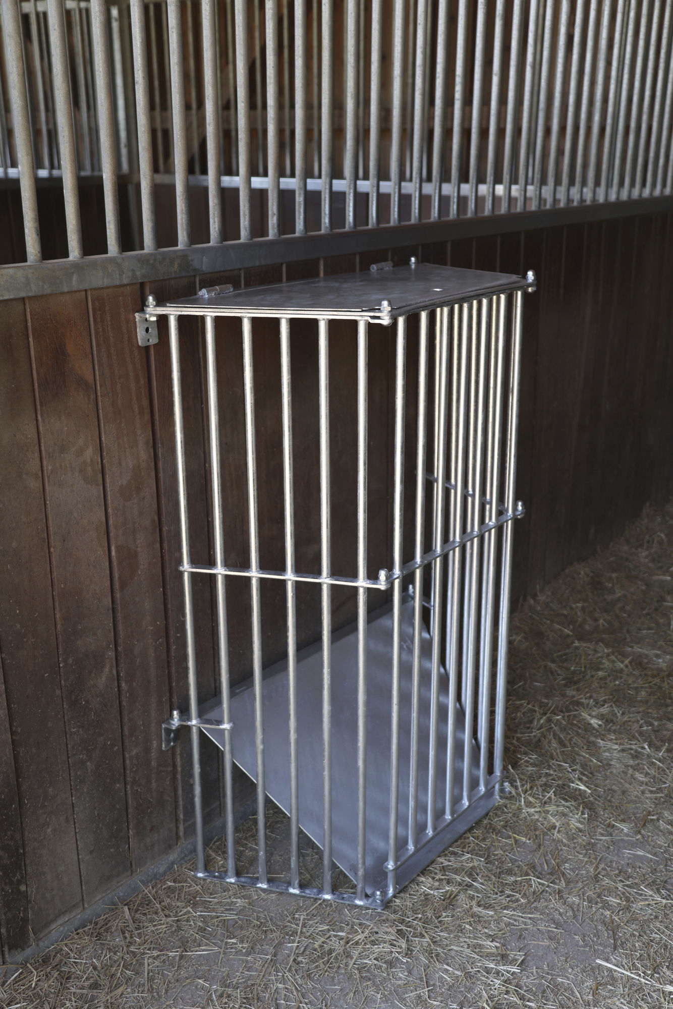 die horizontale Öffnung am Boden verhindert, dass sich Futterreste am Boden anstauen und erleichtert die vollständige Entleerung und Reinigung der Raufe