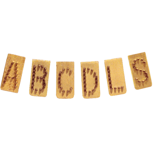 Alphabet, 20 mm Schriftgröße, aus Messing, mit Nadeln aus rostfreiem Stahl in bruchfester Güte (Plattenhöhe 0,3 cm)