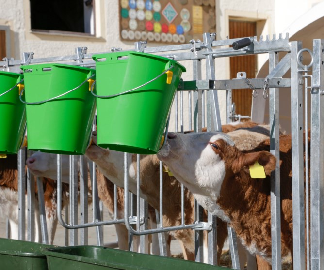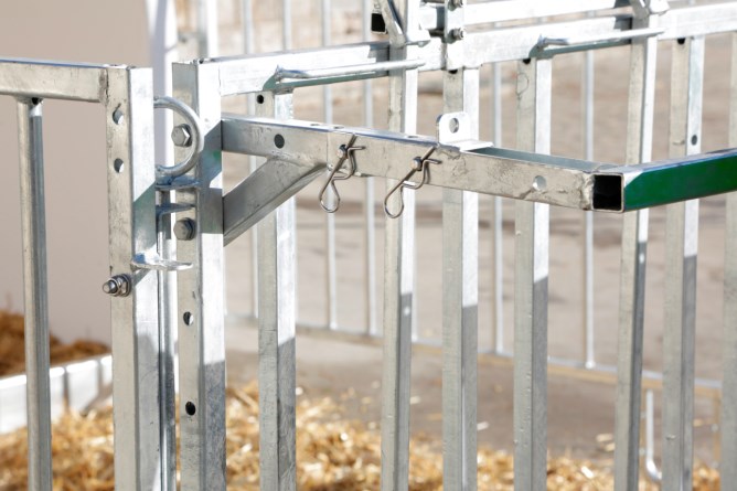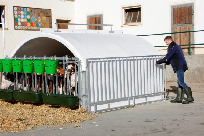 Fressplätze können einzeln versperrt werden,Seitengitter können einfach nach hinten an die Hüttenwände geschwenkt werden,einfacher Zugang via große Eingangstüre, auch Kälberwagen passt durch Tür,vorgebohrte Löcher an Kufen für Strohfang und zur Bodenverankerung,leichter Transport der Hütte und Umzäunung mit Traktor,Tränkeeimer und Langfuttertröge sind im Lieferumfang nicht enthalten