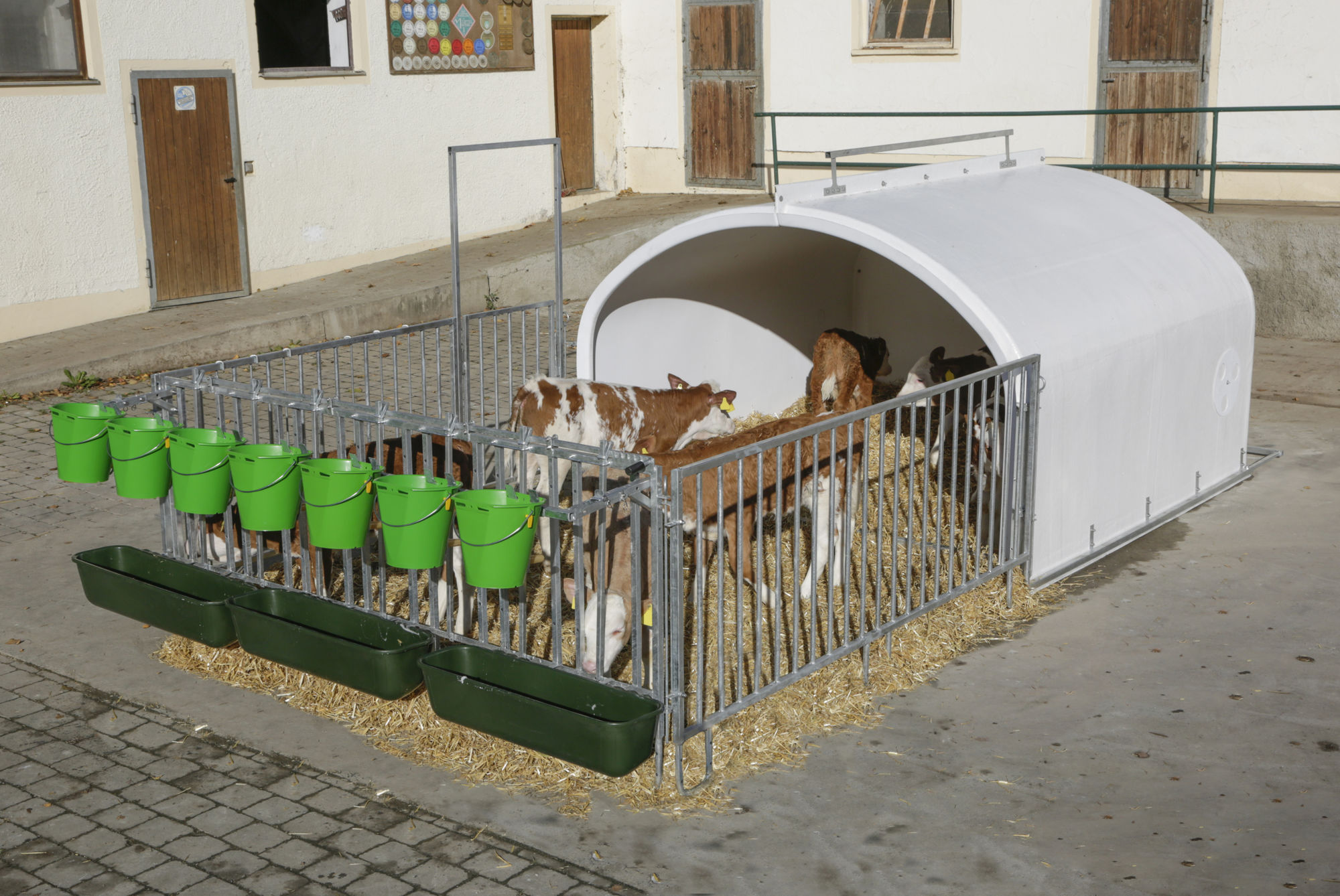 • Frontelement mit durchschwenkbarer Drehtür und feststehendem Tränkebereich, zum idealen Anlernen der Kälber an Nuckeltränken