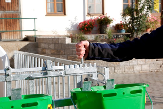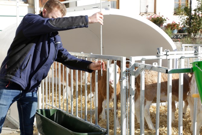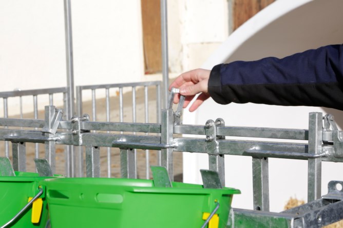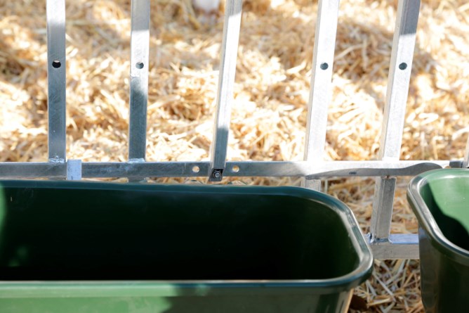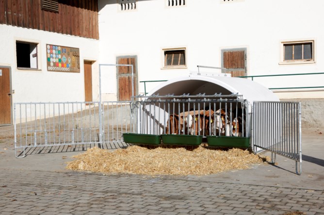 Fressplätze können einzeln versperrt werden,Seitengitter können einfach nach hinten an die Hüttenwände geschwenkt werden,einfacher Zugang via große Eingangstüre, auch Kälberwagen passt durch Tür,vorgebohrte Löcher an Kufen für Strohfang und zur Bodenverankerung,leichter Transport der Hütte und Umzäunung mit Traktor,Tränkeeimer und Langfuttertröge sind im Lieferumfang nicht enthalten